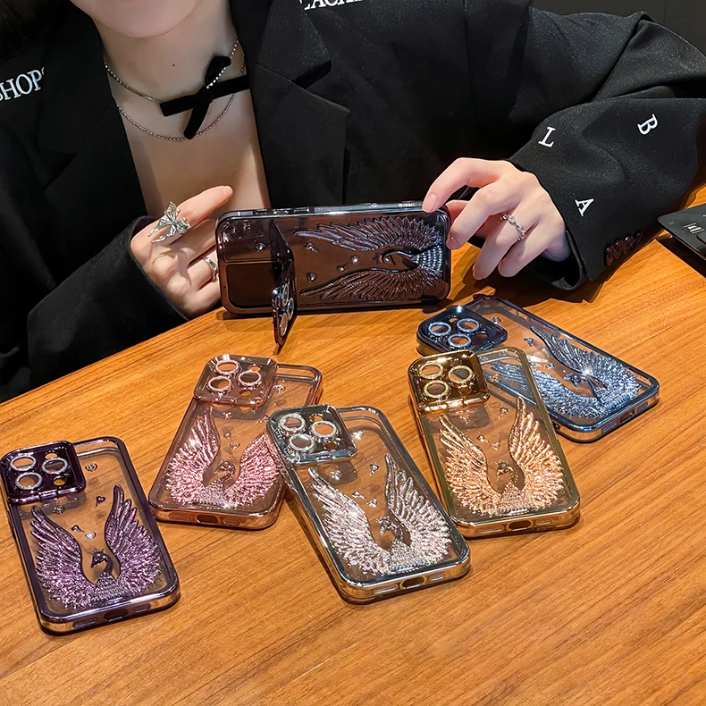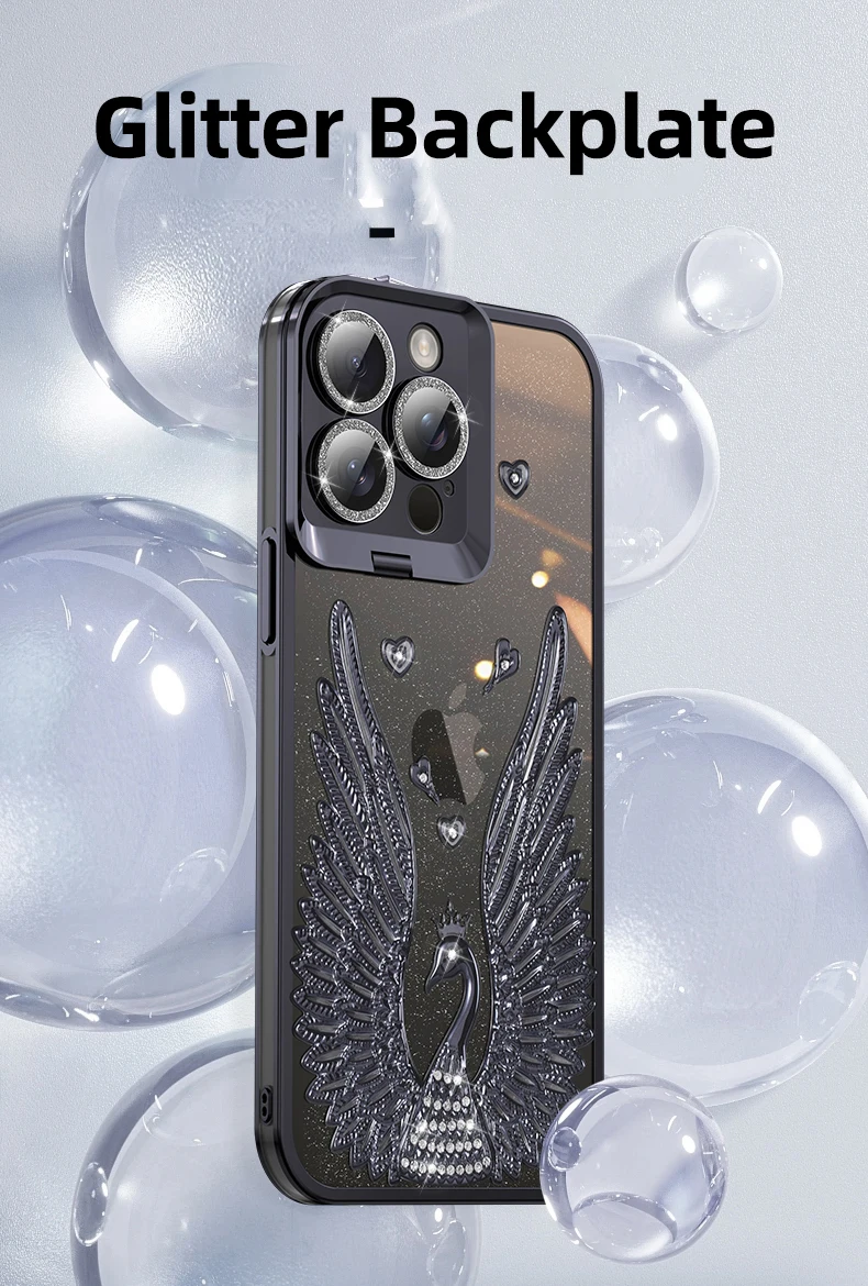 Glitter Diamond Transparent Glass Case With Lens Protection Hidden Bracket For iPhone 15 14 13 12 series