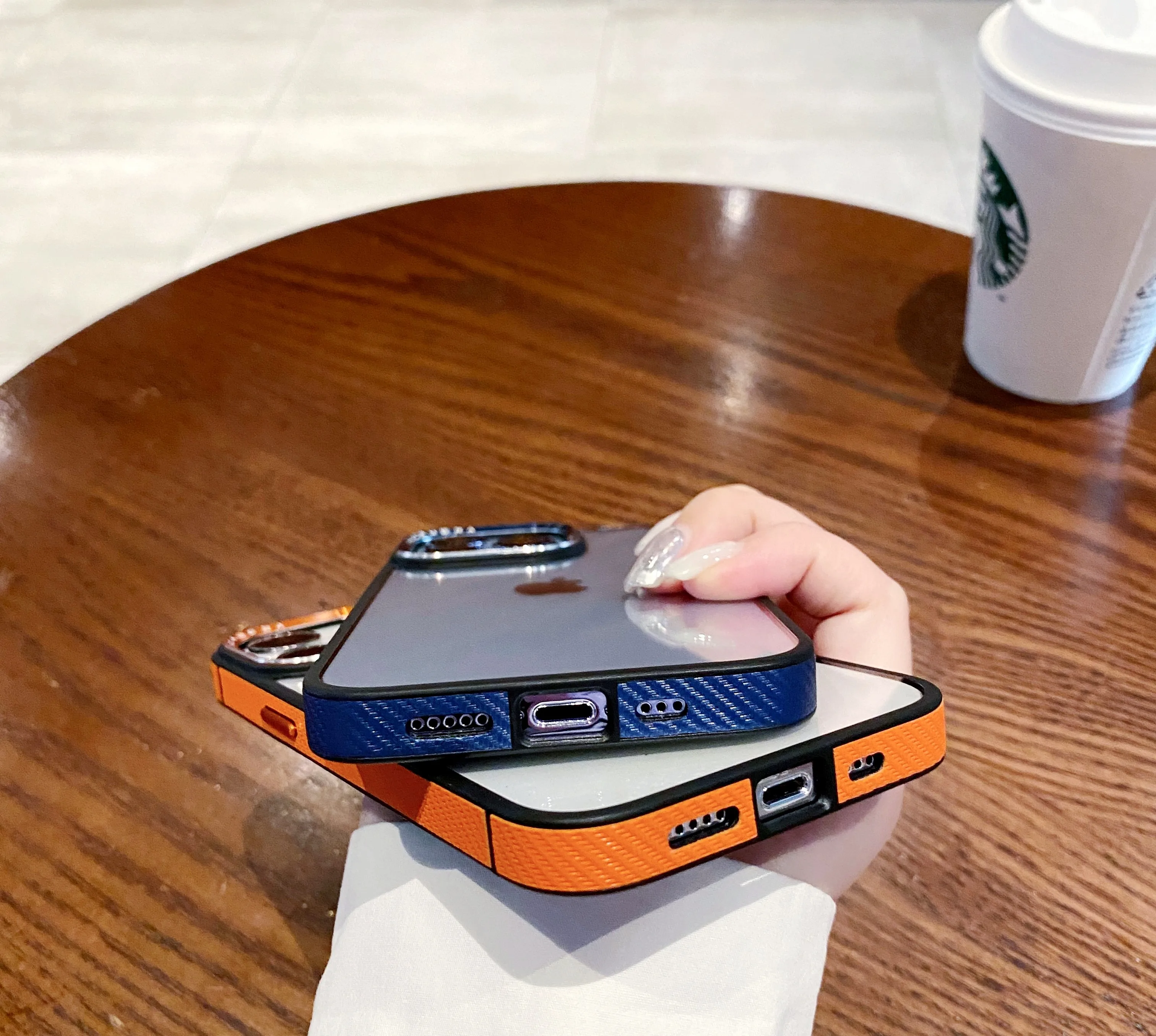 Luxury Carbon Fiber Texture Leather Frame Metal Lens Protection Case For iPhone 15 14 13 12 series