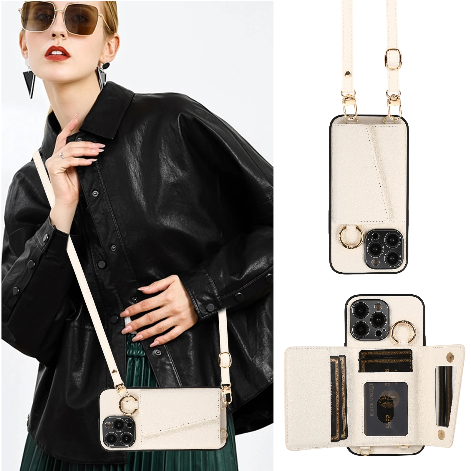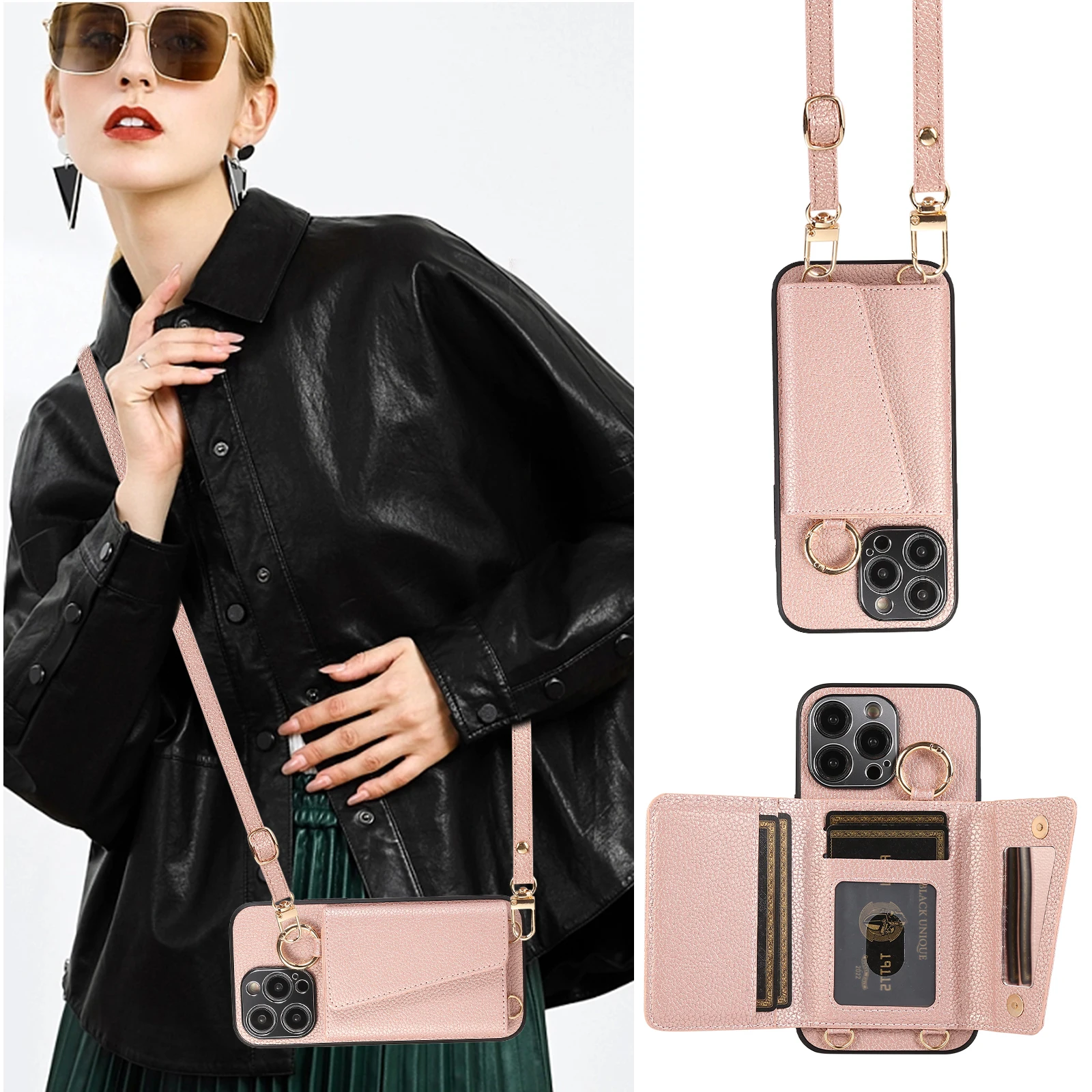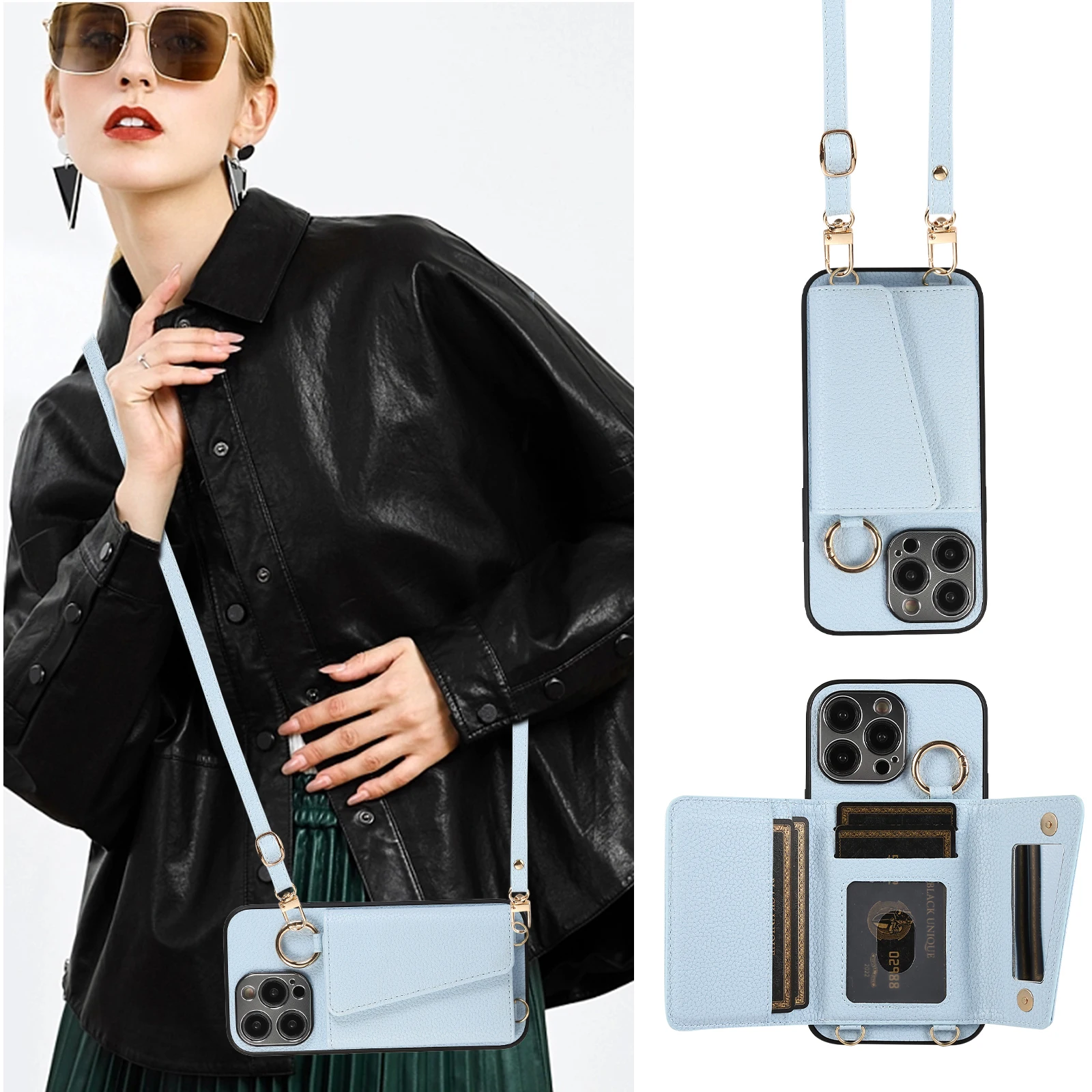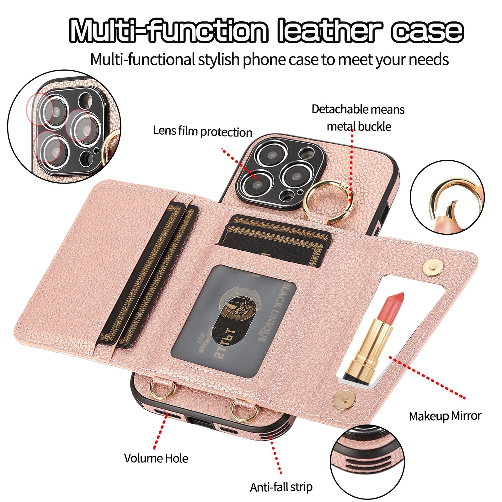 Crossbody Leather Wallet Card Slots Lanyard Strap Mirror Ring Holder Case for iPhone 14 13 12 series
