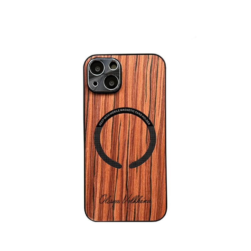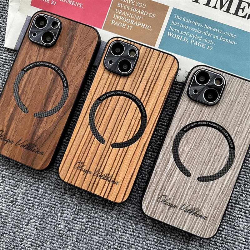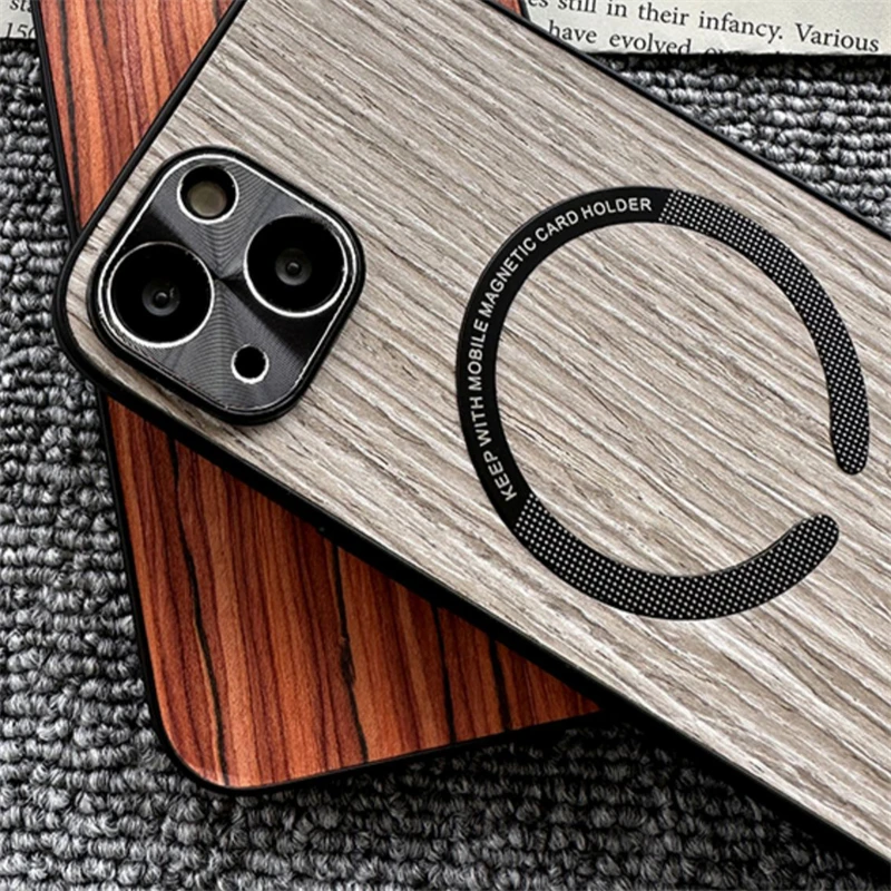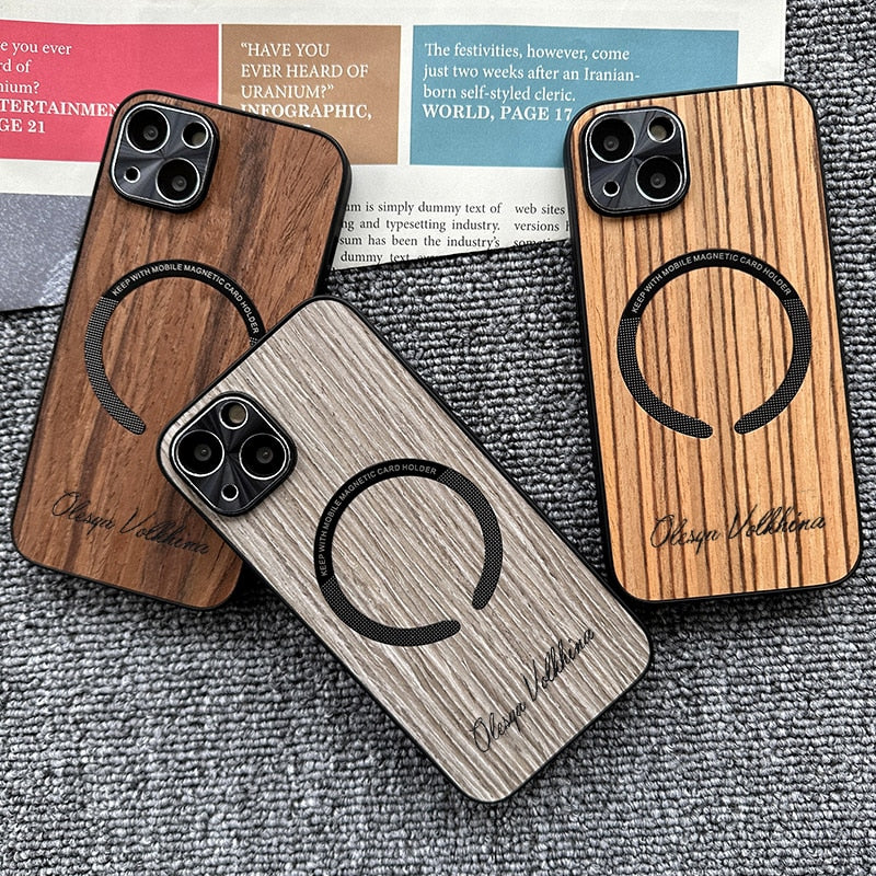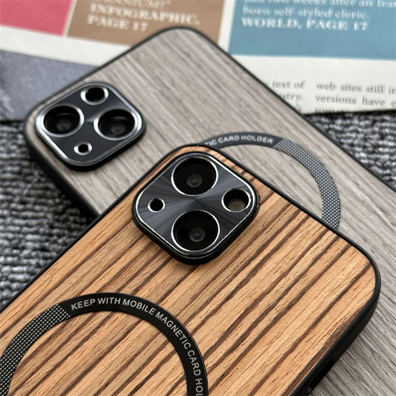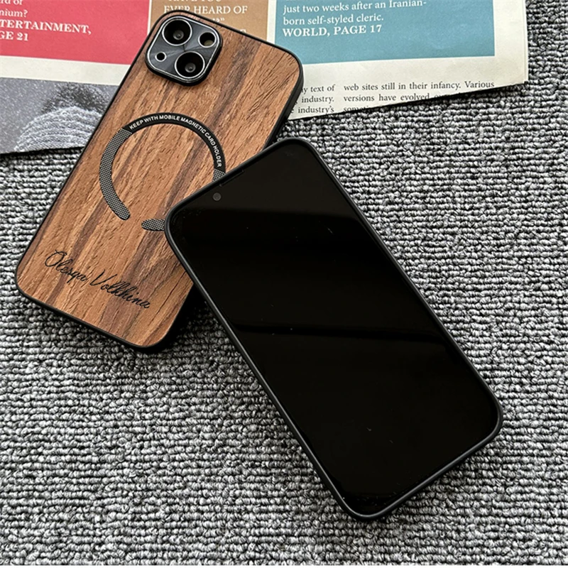 Custom Name Wood Grain Magnetic Magsafe Wireless Charge Shockproof Lens Case For iPhone 14 13 12 series