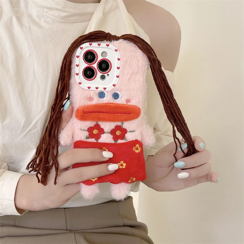 Cute Funny Girl Fluffy Plush Case for iPhone 14 13 12 series