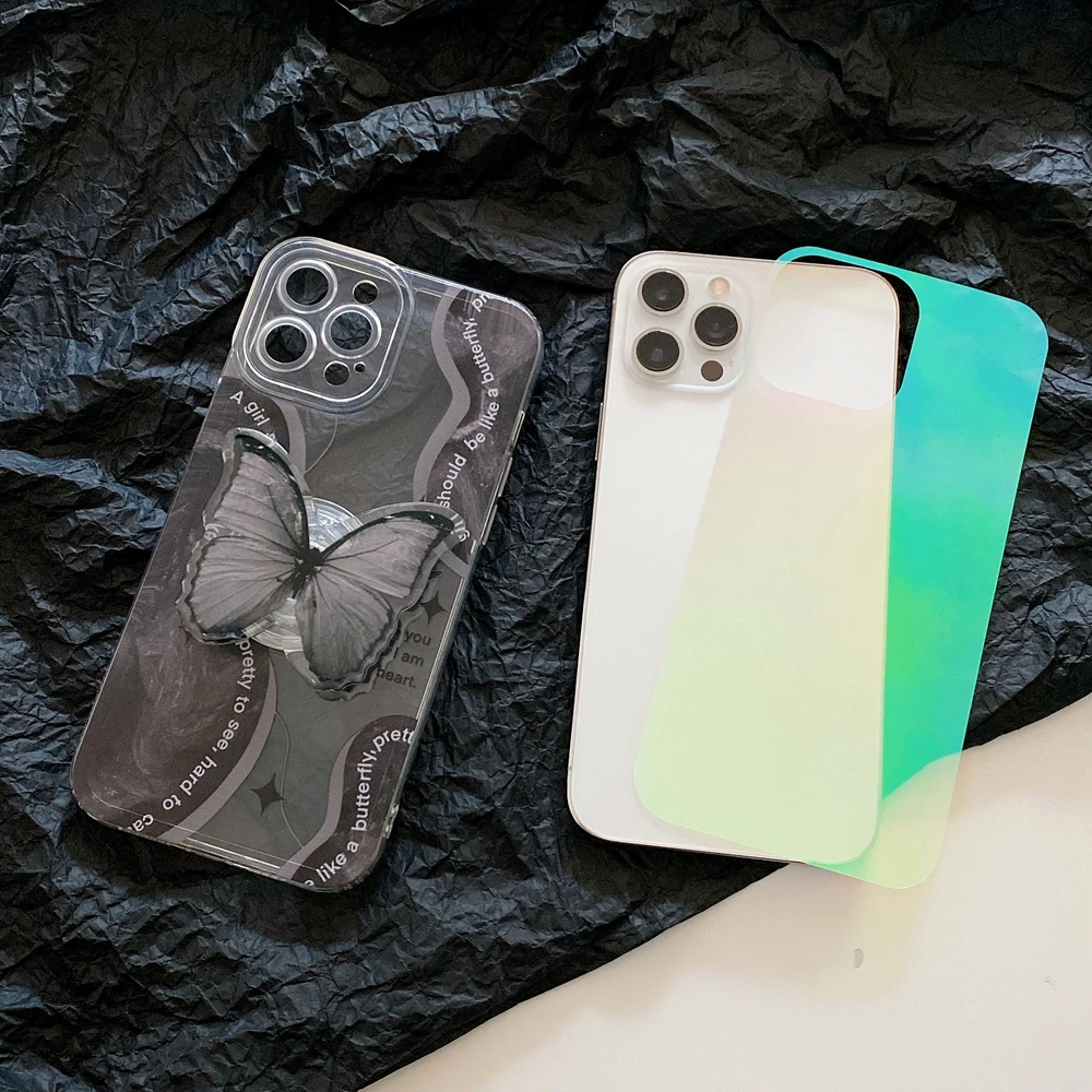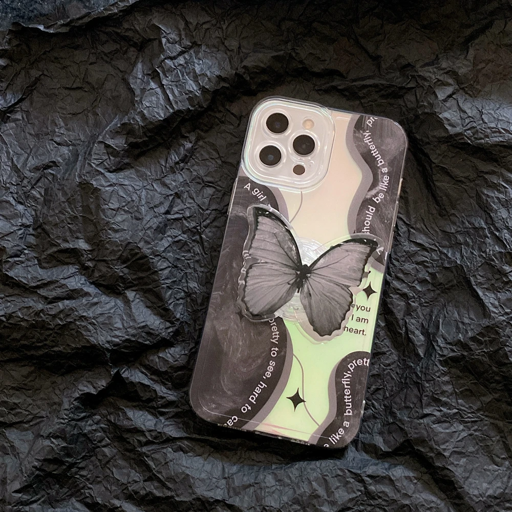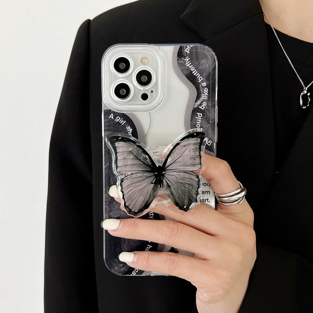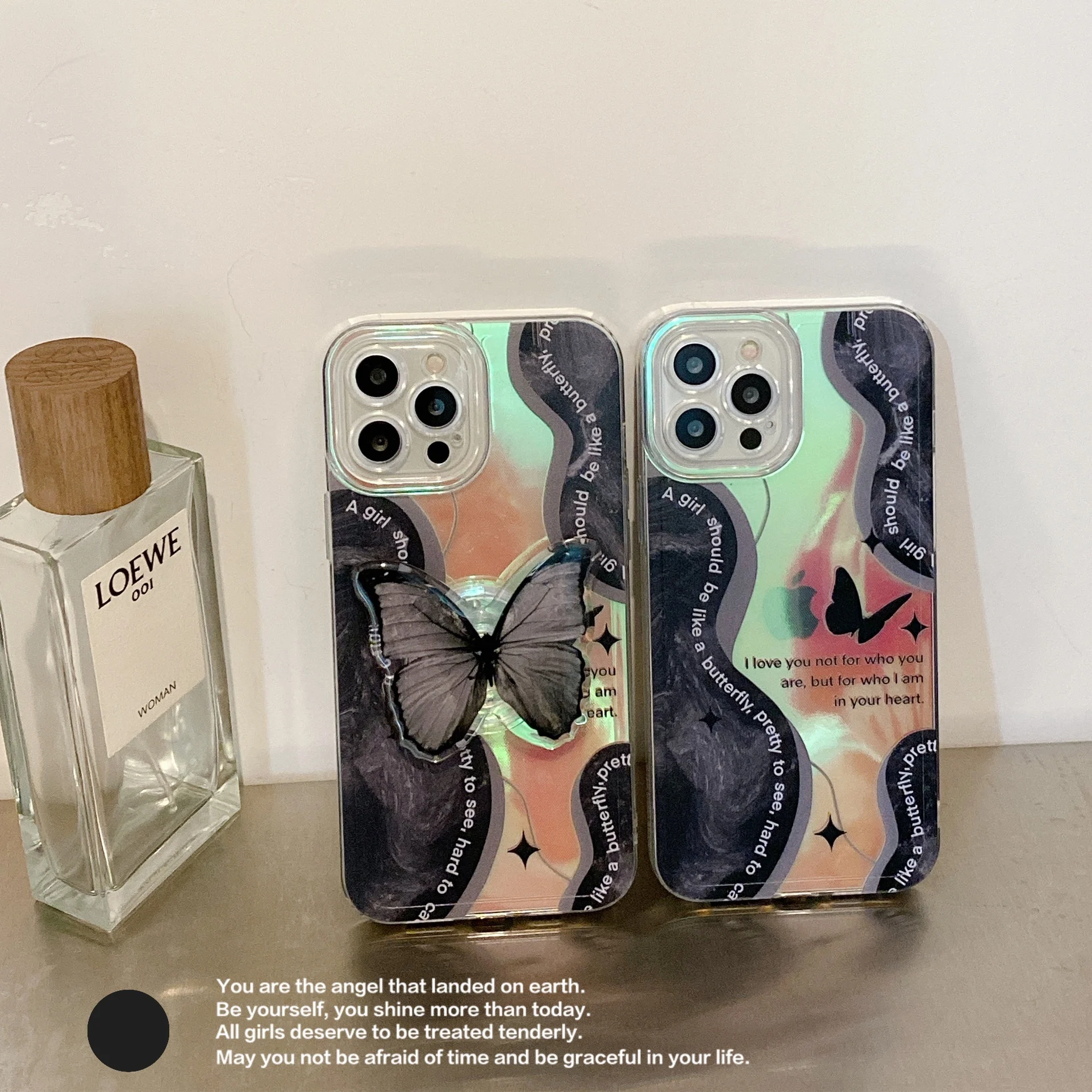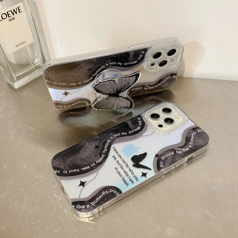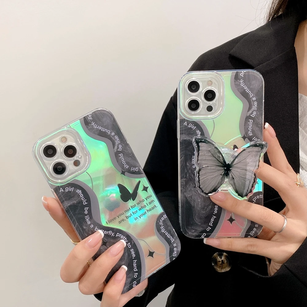 Fashion Black Butterfly Stand Laser Transparent Silicone Case for iPhone 14 13 12 series
