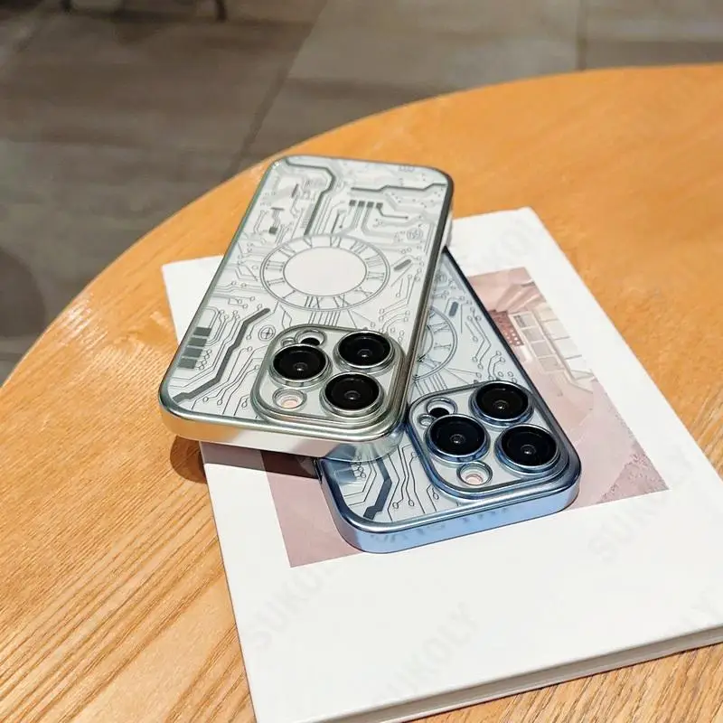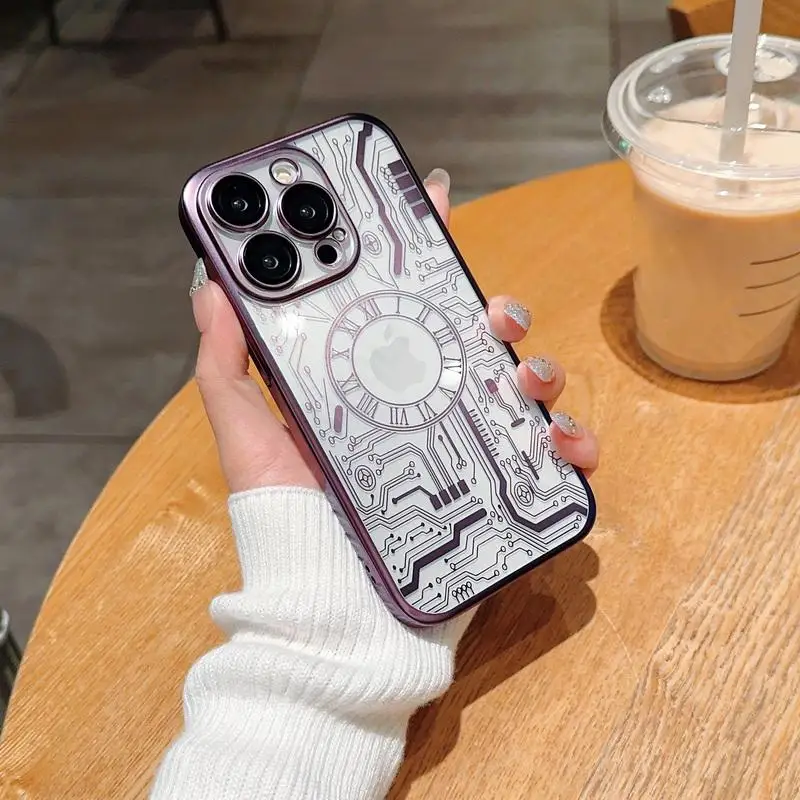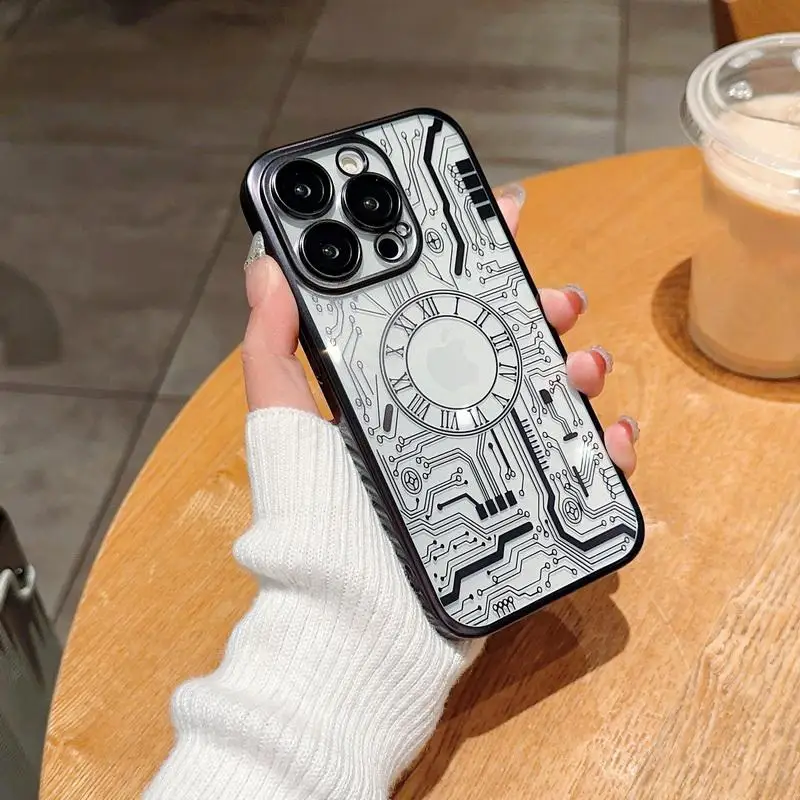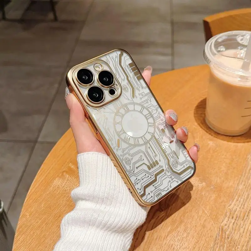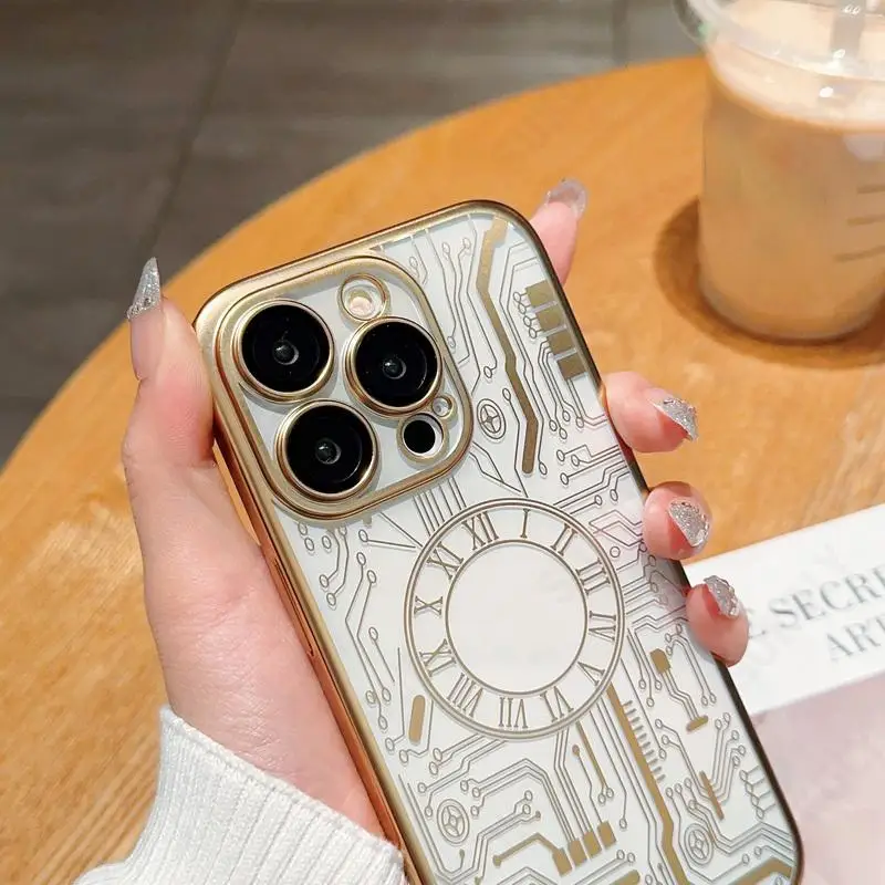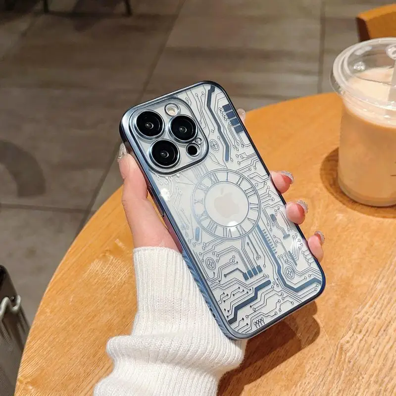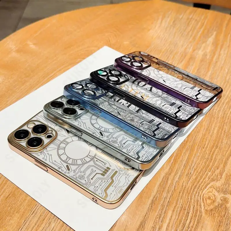 Luxury Plating Circuit Pattern Shockproof Clear Case With Lens Protector Film For iPhone 14 13 12 series