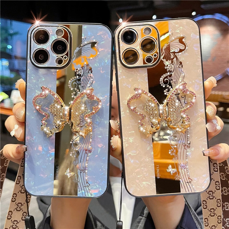 Luxury Rhinestone Glitter 3D Butterfly Bracket Case With Lanyard Holder For iPhone 14 13 12 series