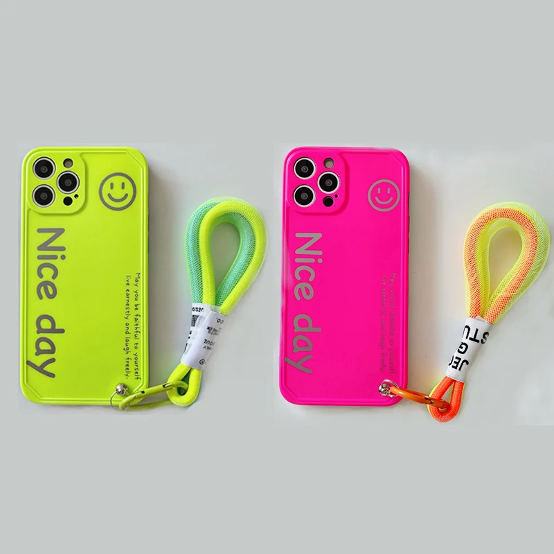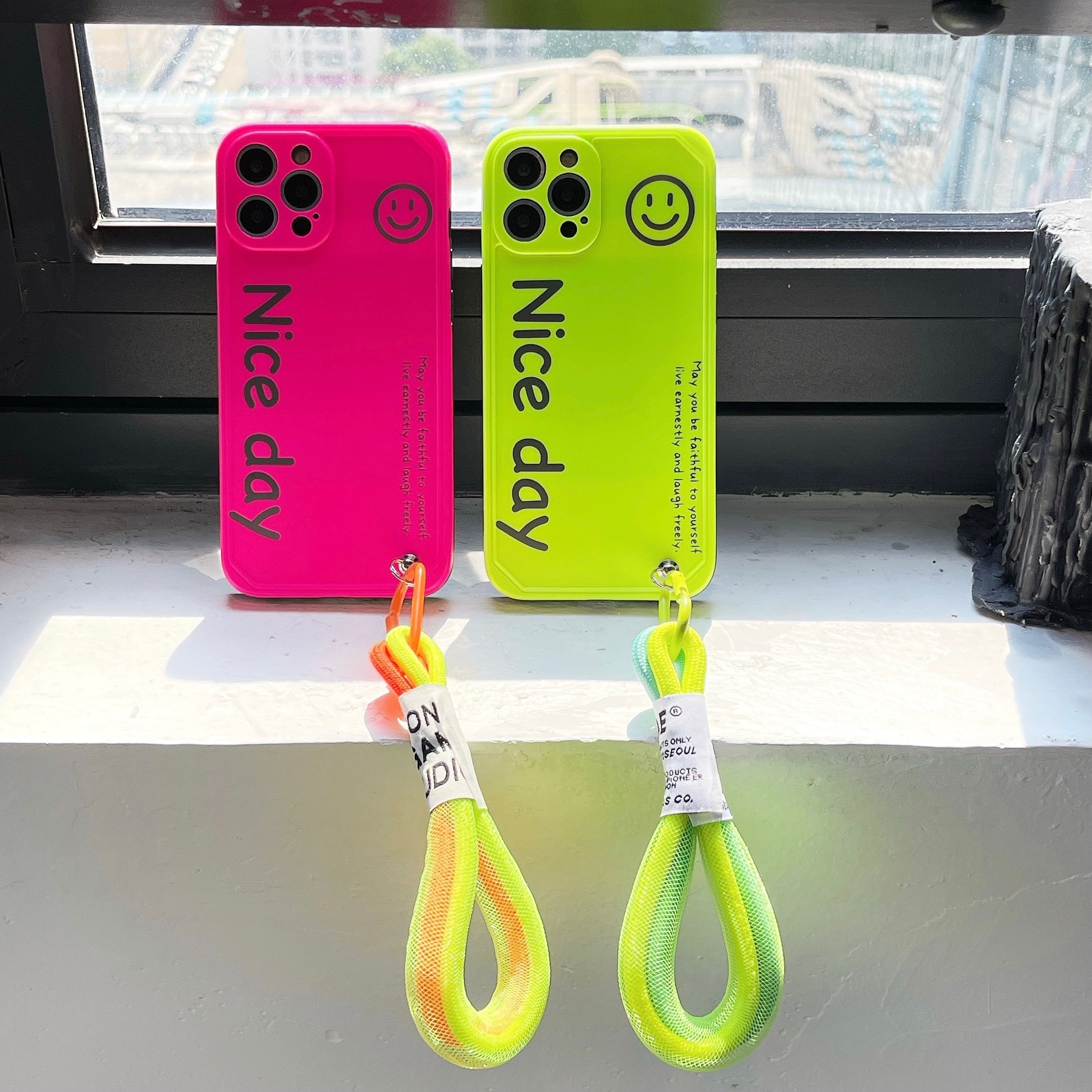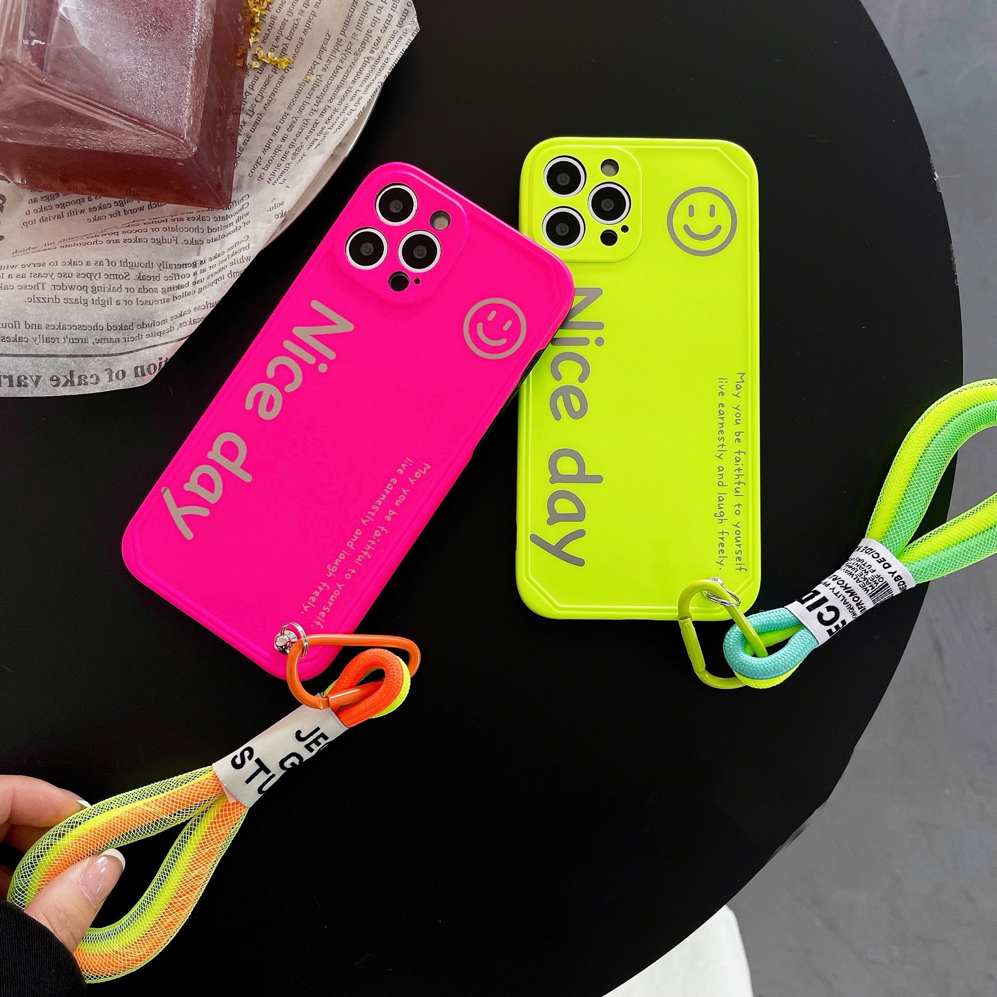 Smiley Fluorescence Lanyard Silicone Case for iPhone 14 13 12 series