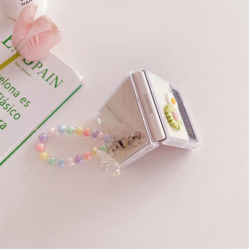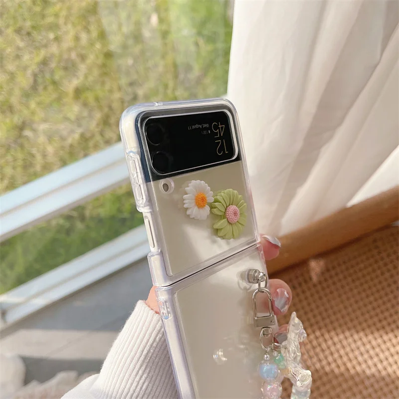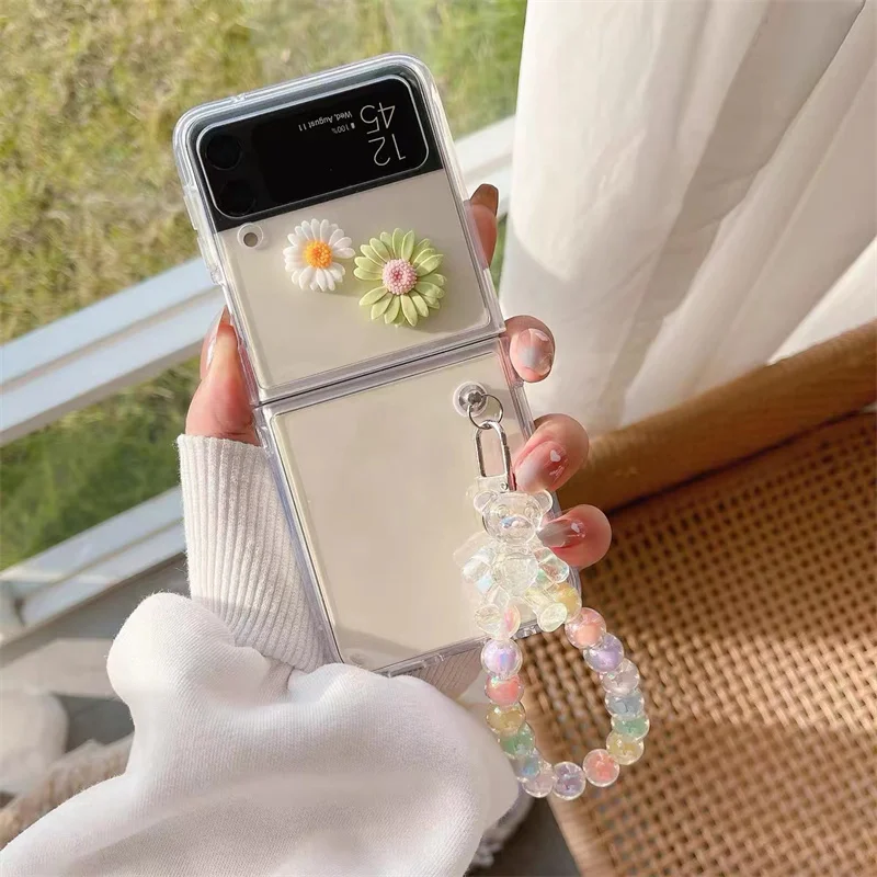 Transparent Daisy Flowers Pearl Bracelet Case for Galaxy Z Flip 3