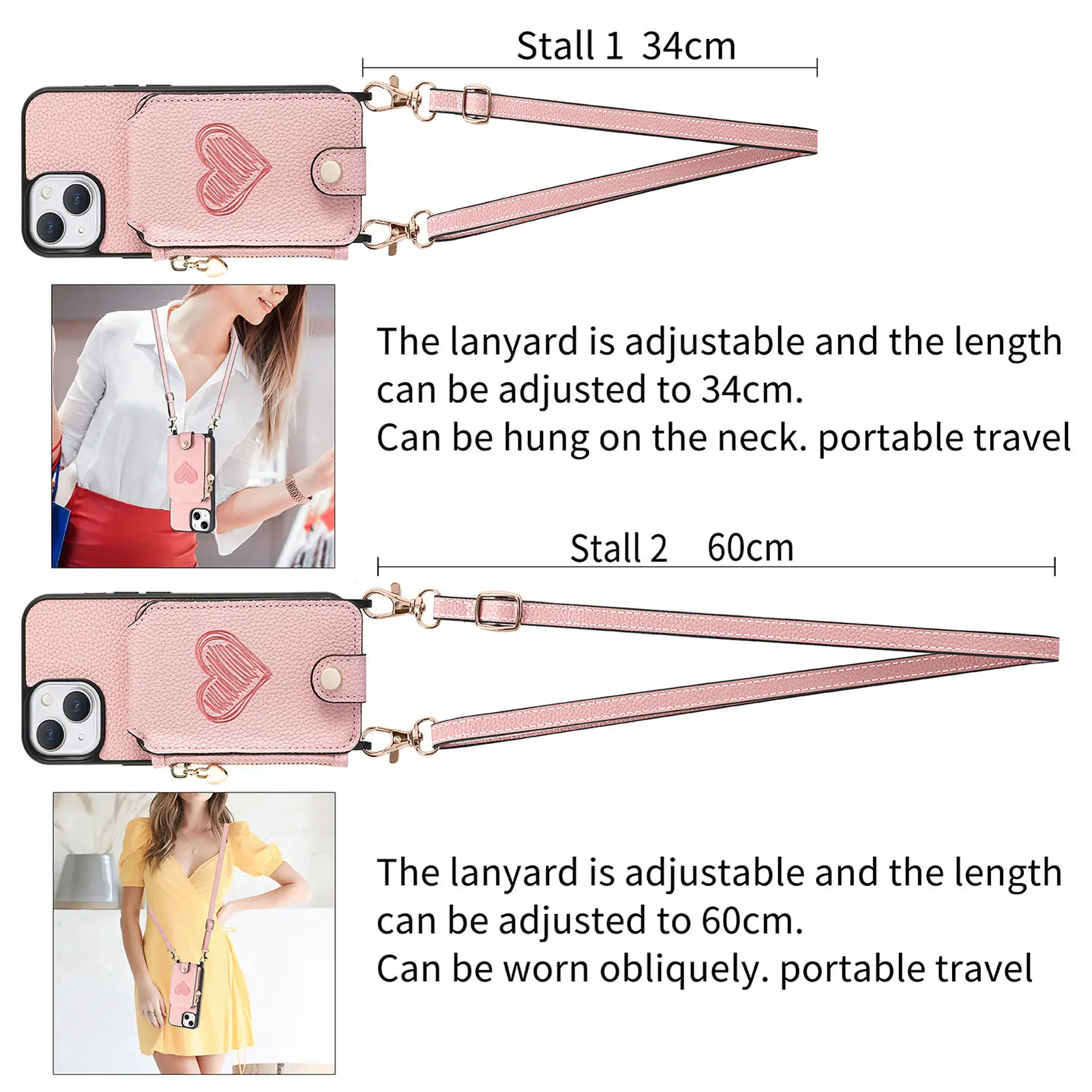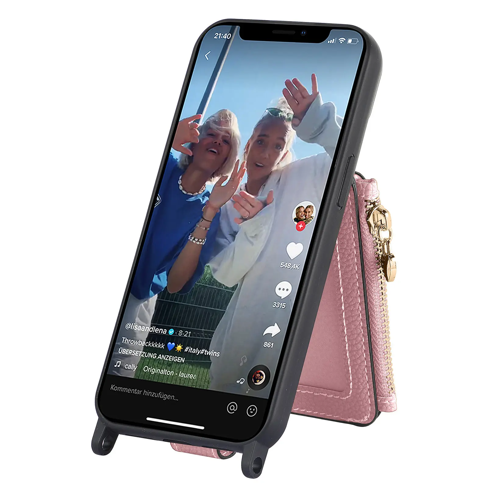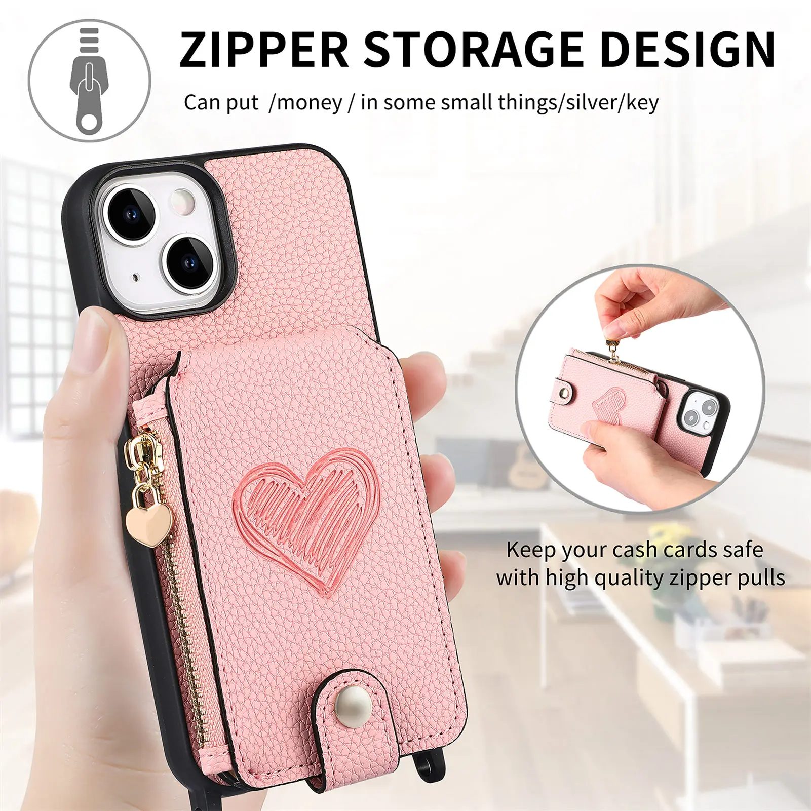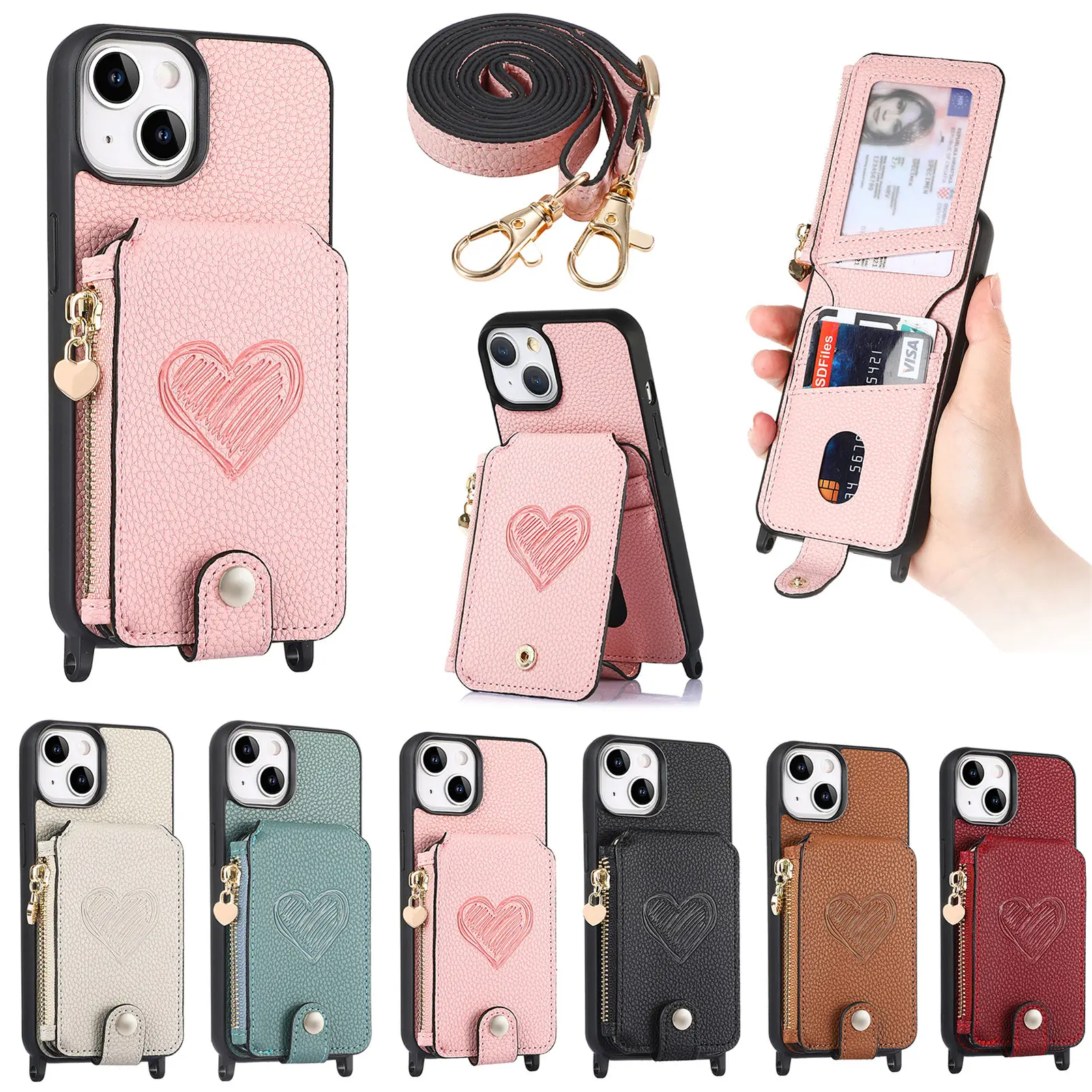 Zipper Wallet Vertical Cards Slot Leather Case With Shoulder Strap For iPhone 14 13 12 series