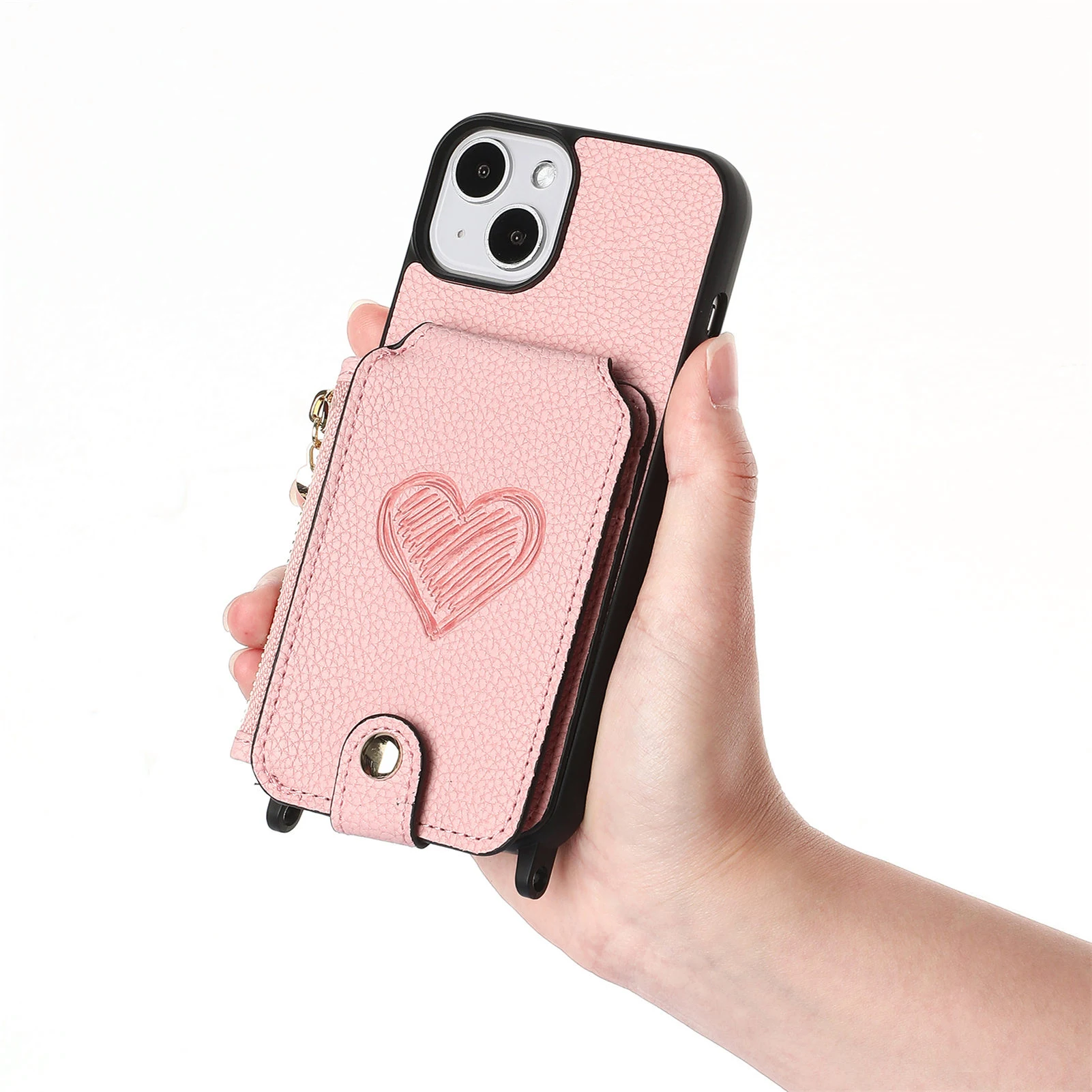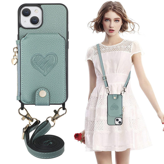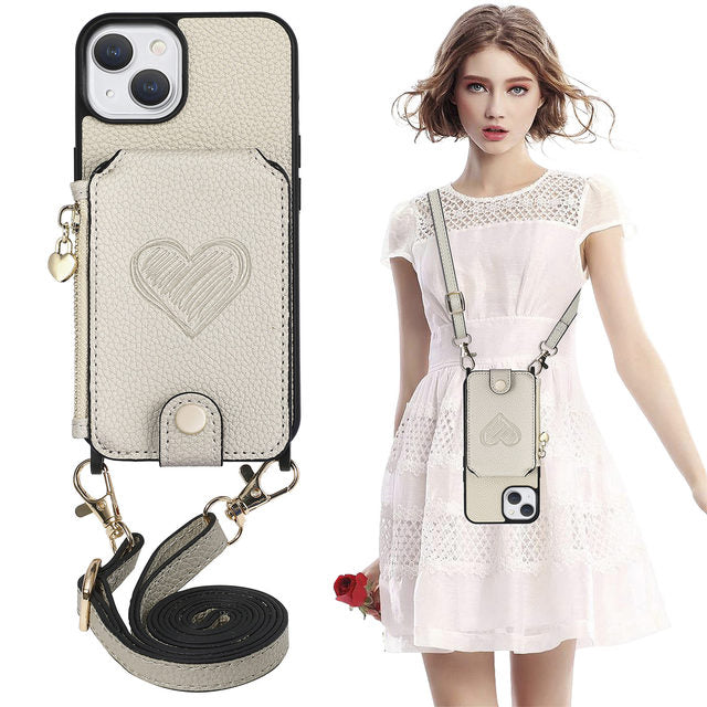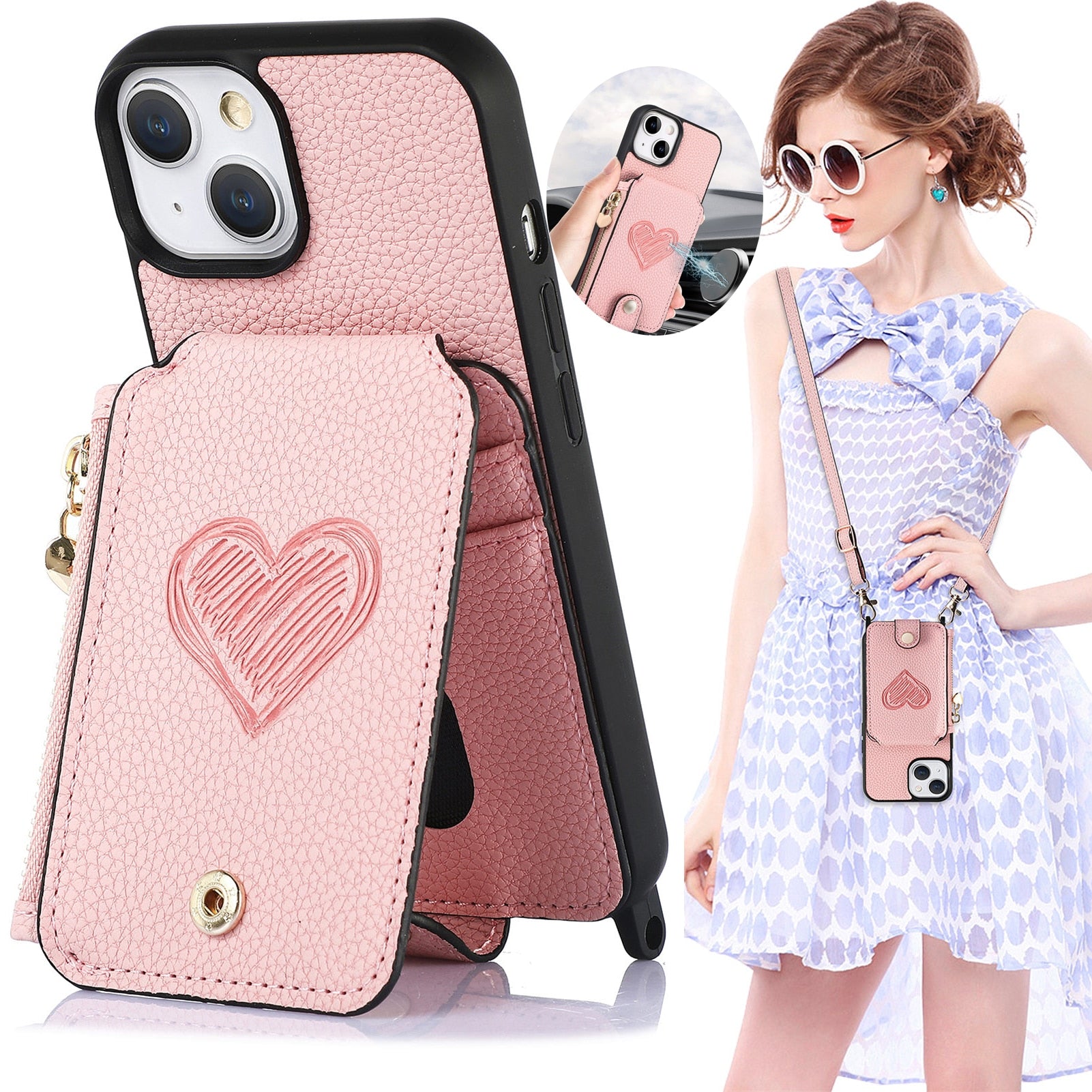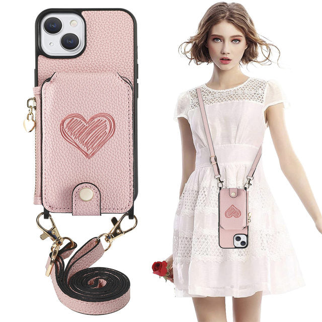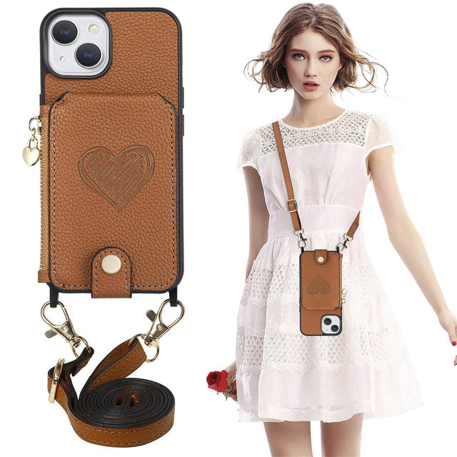 Zipper Wallet Vertical Cards Slot Leather Case With Shoulder Strap For iPhone 14 13 12 series
